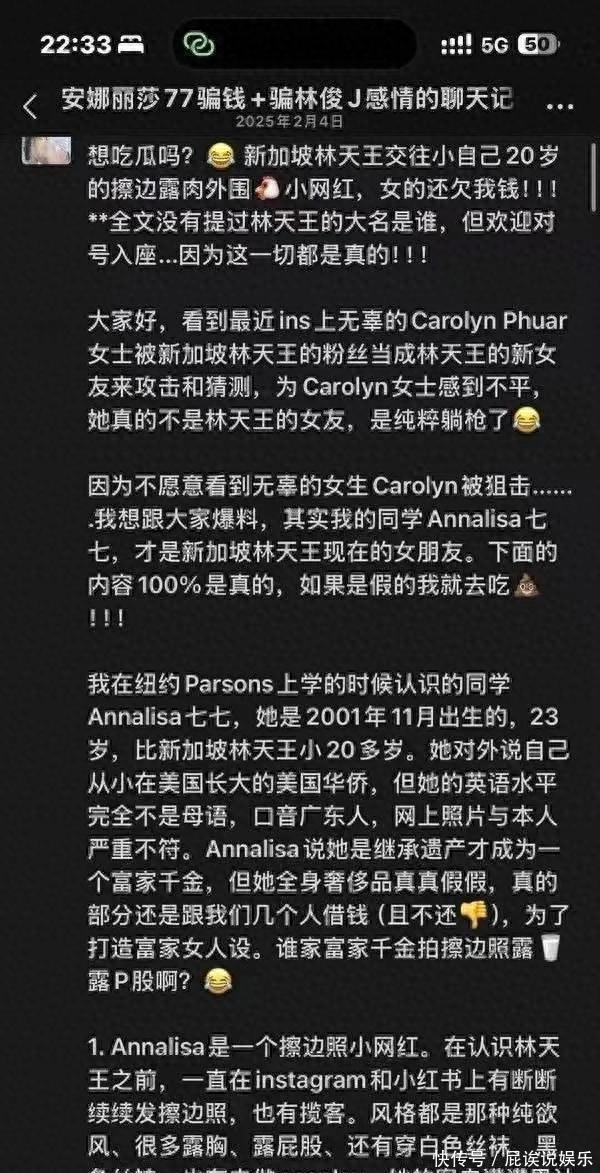 大消息!著名歌手林俊杰于近日官宣了恋情…据资料显示,林俊杰的小女友是现年23岁的网红“七七”,相比于44岁的林俊杰足足小了21岁,差点完成翻倍!具体情况是,2025年12月29日,林俊杰在母亲70岁寿宴上公开与23岁华裔网红"七七"(Annalisa)的恋情,鉴于两人悬殊的年龄相差以及这位新女友网红的身份,从而引发了网友们的热议!而这位名为“七七”的网红身份则有着诸多的争议,有人说是富家女,豪门千金;有人说是人为造人设之下的“假豪门千金”!而通过已知资料显示,“七七”为美籍华裔,毕业于纽约帕森斯设计学院,参与过奢侈品牌设计股票10倍配资,现任林俊杰个人潮牌SMG创意总监。父亲为广东上市公司高管,母亲留丰厚遗产,名下拥有东京、纽约等多地房产,海外社交平台粉丝超20万。从这些资料可以发现,这位女王红的身份疑点重重,给人一种虚浮的感觉,真不知道身价不菲的林俊杰到底是如何找她做女友的!除此以外还有网友曝出了惊人的“内幕”,用来佐证“七七”的真实面孔!网友爆料: