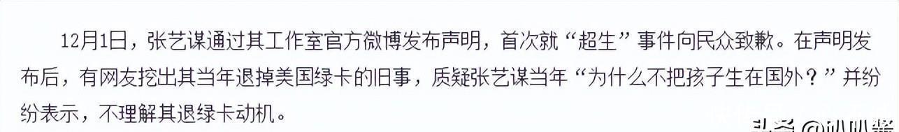 调查结果未出之前,舆论持续发酵,张艺谋早些年推掉美国绿卡的旧事被网友挖出。不少网友表示看不懂他的操作,要是不退绿卡,把孩子生在国外,就不会存在“超生”。